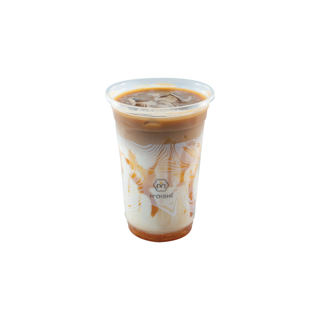 Ice cream salted caramel, milk, caramel sauce, salted caramel syrup, ice and whipped cream.